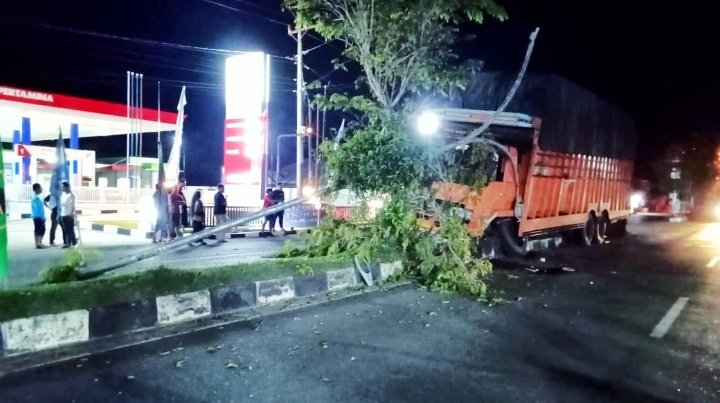 Diduga Sopir Mengantuk, Truk Fuso Hantam Pembatas Jalan di Meulaboh