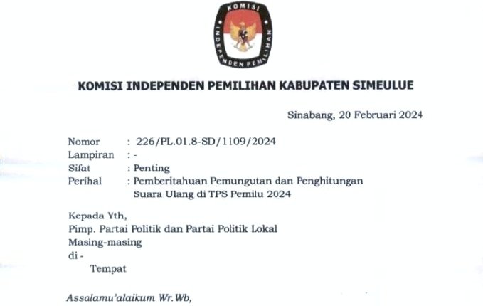 BSINews.id | Simeulue – Komisi Independen Pemilihan (KIP) Kabupaten Simeulue, secara resmi menerbitkan surat rekomendasi pelaksanaan Pemungutan Suara Ulang (PSU) di tujuh Tempat Pemungutan Suara (TPS) Pemilu 2024 yang tersebar pada tiga kecamatan di kabupaten setempat.
