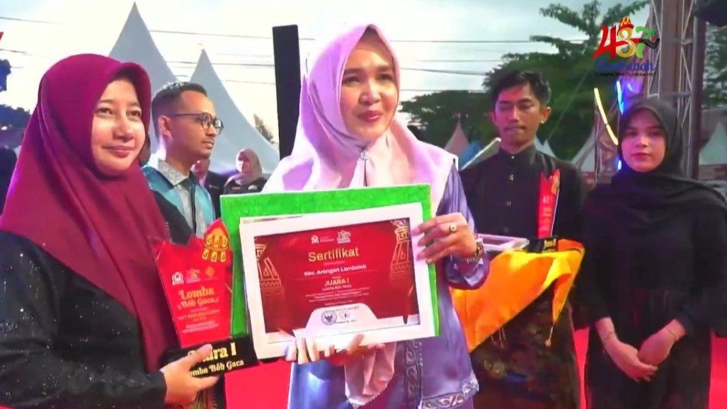 Para pemenang lomba dipersilakan naik ke atas panggung utama untuk menerima piagam dan hadiah penghargaan. Penyerahan dilakukan langsung oleh Ibu Kartika Eka Sari, S.STP., M.Si, selaku Kepala Bidang Kebudayaan Dinas Pendidikan dan Kebudayaan (Disdikbud) Kabupaten Aceh Barat.