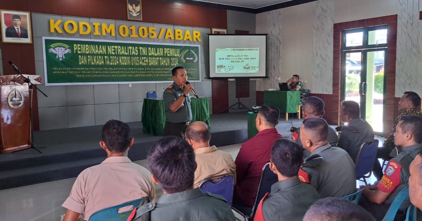 BSINews.id | Aceh Barat – Sebagai salah satu indikator penting dalam menyukseskan Pemilu 2024, Kodim 0105/Abar menggelar sosialisasi pembinaan netralitas TNI di aula Makodim setempat, Desa Drien Rampak Kecamatan Johan Pahlawan, Rabu, 31 Januari 2024.